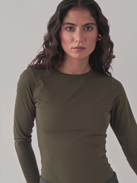 The must-have long-sleeved top in our favorite green. Round neckline + asymmetrical back opening. Thong panty with snaps for a perfect fit.